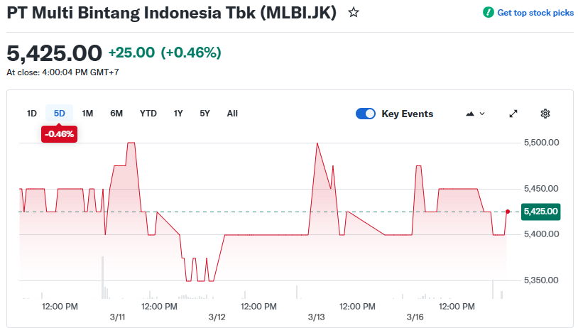 Saham PT Multi Bintang Indonesia Tbk (IDX: MLBI) bergerak relatif stabil pada perdagangan Senin, 16 Maret 2026, ketika investor mencerna perkembangan kinerja keuangan terbaru perusahaan serta strategi ekspansi yang baru-baru ini diumumkan oleh manajemen. Emiten produsen minuman bermerek Bir Bintang tersebut menutup sesi perdagangan reguler di level Rp5.425 per saham, naik sekitar 0,46% dibandingkan penutupan sebelumnya, menurut data perdagangan pasar. (IDN Financials)
