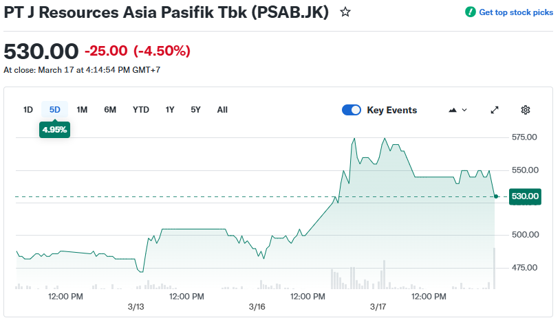 - Saham PSAB turun 4,50% ke Rp530 pada Rabu, 18 Maret 2026, dipicu sentimen pasca divestasi tambang emas Doup.